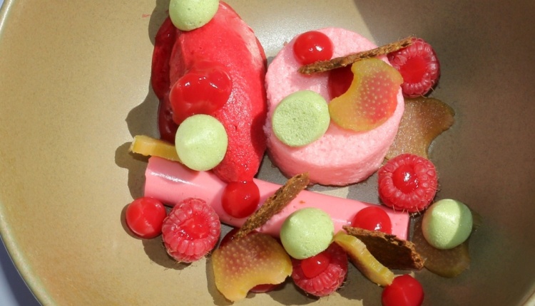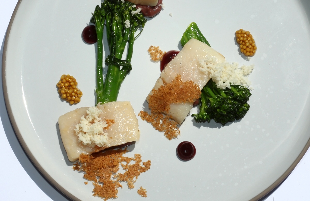 Die delikate Kombination aus Tranchen vom Forellenfilet, frischem Meerrettich, wildem Brokkoli (Stängelkohl), in Apfelessig, Salz und Zucker eingelegter Senfsaat, einem Blaubeeressig-Gel sowie einer Sauerteigzubereitung (eine Mischung aus Sauerteigbrot, Wasser, Essig, Senf und Estragon wird püriert, zu einer Rolle geformt und gebacken) punktet mit einem feinen Spiel von Säure und Schärfe und vielen frischen Aromen