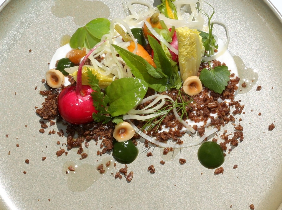Bunt, leicht und extrem geschmackvoll: Erbsensprossen, Gartenmelde, Löwenzahn, Sauerklee, Taubnessel, Wiesenkerbel, junger Mangold, Minikarotten, Salatherz – angerichtet auf einen Schafsjoghurtspiegel. Dazu Zitronenconfit, in Öl, Apfelessig und Salz marinierter Kohlrabi, glasierte Radieschen, ein Gartenkressegel sowie leicht angeröstete Haselnüsse. I-Punkt ist der würzige, ins süßlich-lakritzig gehende Geschmack des gebröselten Pumpernickels.