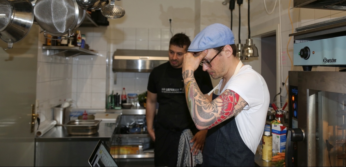 Restaurantleiterin Linda Stößer, fördert die Gemütlichkeit mit einem Glas vom Wiener Gemischten Satz und ich warte auf Sebastian Radtke, den „gärtnerei“-Küchenchef. Ein bisschen Smalltalk mit dem Mann, der seine Kreativität hier in Essbares umsetzt. Doch Radtke lässt mich warten, der Küchensegen hängt schief. Nana, der Spüler, den Minuten zuvor noch alle über den grünen Klee gelobt hatten, bekommt einen knalligen Anpfiff. Er hat Rühreier gemacht, Personalessen für die Brigade, Rühreier mit frischen Erbsen. „Ausgerechnet die Erbsen“, ereifert sich Sebastian Radtke, „wenn heute Abend volles Haus ist, sehen wir alt aus, Mann, Mann, Mann.“