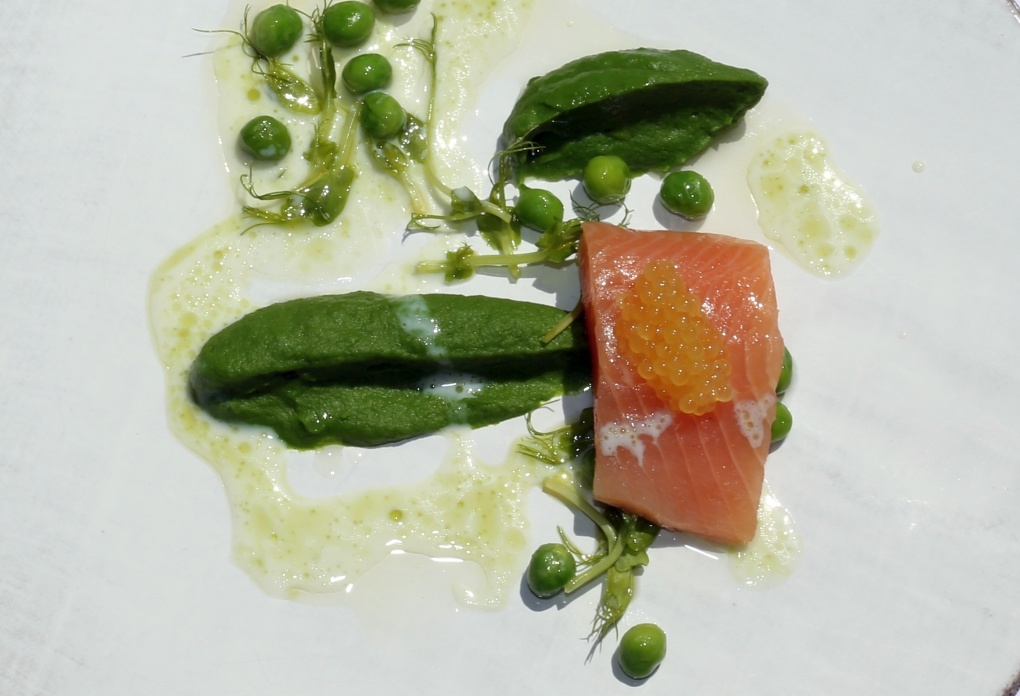 Ein Gericht, bei dem sich alle Komponenten – der Saibling mit seinem Kaviar, die mit Estragonöl und ausgelassenem Speckfett gewürzte Buttermilch, ein kraftvolles, aber nicht dominantes Lauchpüree, sowie grüne Erbsen und Erbsensprossen geschmacklich harmonisch zusammenfügen. Und nicht zuletzt ist diese Kreation auch optisch eine Augenweide.