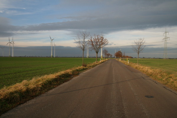 Die A9 in Richtung Süden. Der Hohe Fläming, die Elbbrücke bei Vockerode, Dessau-Ost, die Ausfahrt Bitterfeld. Plattes Land in herbstlichen Farben, darauf Dutzende Denkmäler des neuen Energiezeitalters.