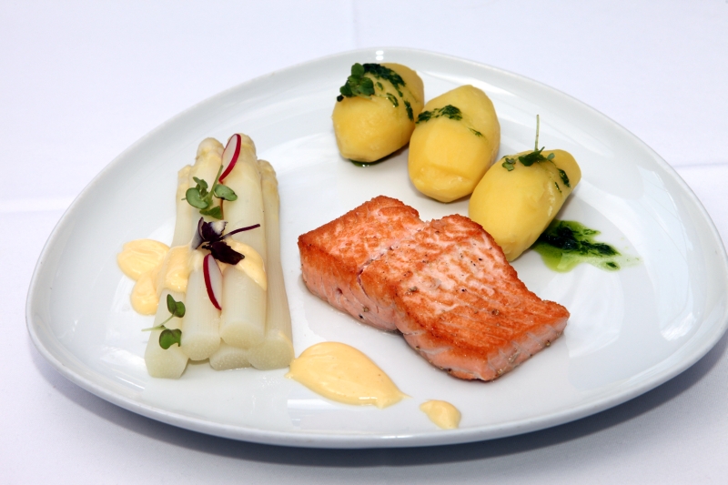 Harry Wolleschak, 47, Berliner gastronomisches Urgestein und 2011 mit seiner Eselin von A. in Wannseenähe gelandet, sieht die Sache mit dem Spargel gelassen: „Meine Gäste lieben das frische Gemüse aus Beelitz“, erklärt Wolleschak. „Das wichtigste ist die Zubereitung, der Spargel muss so auf die Teller kommen, dass er noch Biss hat.“ Fünf Gerichte mit Beelitzer Spargel serviert seine Küchenbrigade – allesamt Klassiker.