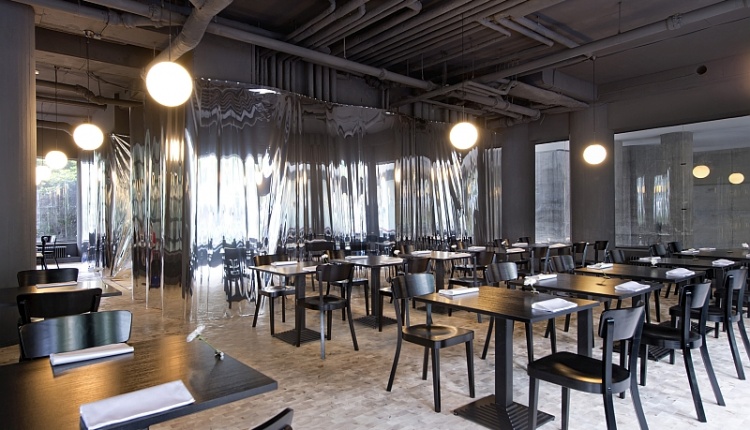 Das Restaurant, ein ehemaliges Sportstudio auf der verschlafenen Seite der Uhlandstraße, versteckt sich hinter viel Grün und ist tatsächlich eine riesige Glaskiste. Unbehandeltes Kieferparkett, Wände und Decken mattschwarz, und als Blickfang ein gewaltiger Vorhang aus metallischem Polyester, der ein bisschen wie ein Geisterbahn-Spiegel daherkommt.