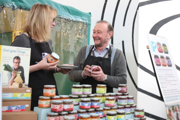 „In der Markthalle Neun hast Du automatisch Aufmerksamkeit, da kannst Du anbieten, was Du willst“, so hört man es gelegentlich von Händlern an anderen Orten. Mal davon abgesehen, dass x-beliebige Angebote dort gar nicht erst zugelassen werden, sind die meisten Kunden, die hierher kommen, bestens informiert und wissen Schrott von Wert zu unterscheiden. Und weil das so ist, erfährt auch der kleinste Stand große Zuwendung. Ein Tisch, ein Tuch, ein paar Pappen, das ist Pink’s. “Welcome to Pink’s! Welcome to simple food-quality that’s pure and untainted“, heißt es hier.