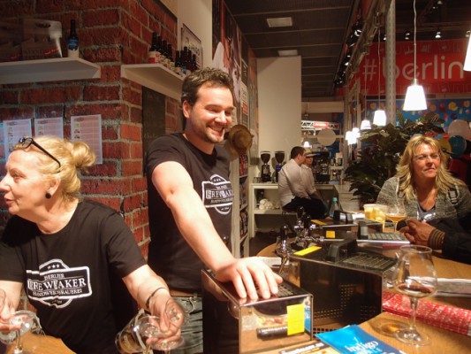 Micha Schwab, Inhaber der Moabiter Privatbrauerei brewbaker stellte durstigen Grüne Woche-Besuchern erstmals seine neueste Bier-Kreation vor: Das leicht ölige und bittere, von Farbe, Textur und Geschmack her an Guiness erinnernde „Espresso Stout“-Vollbier wird mit Arabica-Bohnen aus der Berliner Kaffeerösterei Origo gebraut und erweitert in Kürze das Verkaufssortiment von brewbaker.