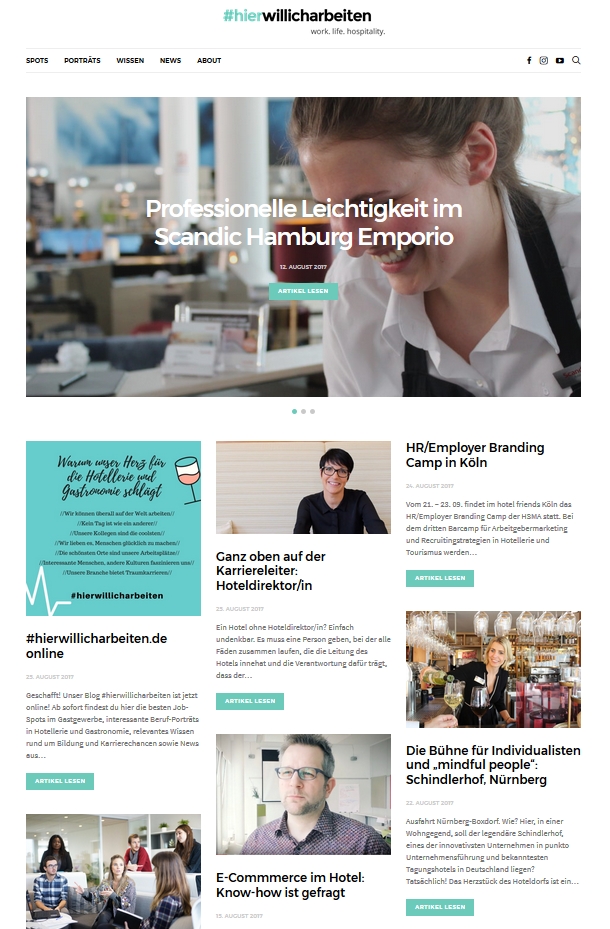 Das Team von hierwillicharbeiten.de besucht Hotels und gastronomische Betriebe, fängt die Arbeitsatmosphäre ein und spricht mit den Mitarbeitern vor Ort über das Arbeiten im jeweiligen Unternehmen. Die zahlreichen Interviews, die die DHA bereits im Vorfeld mit Fachkräften vom Housekeeping über den Service bis hin zur Hoteldirektion geführt hat, zeigen, dass viele Mitarbeiter im Gastgewerbe ihren Beruf als Gastgeber leidenschaftlich ausüben. Weil zufriedene Mitarbeiter die besten Botschafter für die Branche sind, spielen sie eine Hauptrolle im Blog: In Interviews erklären sie, warum sie sich für den Beruf und den jeweiligen Arbeitgeber entschieden haben.