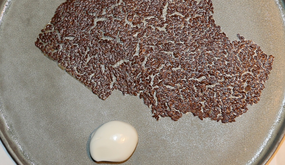 Mit Stärke gebundene und im Ofen geröstete Leinsamen. Dazu Schafsjoghurt, der keine Abmagerung durchmachen musste.