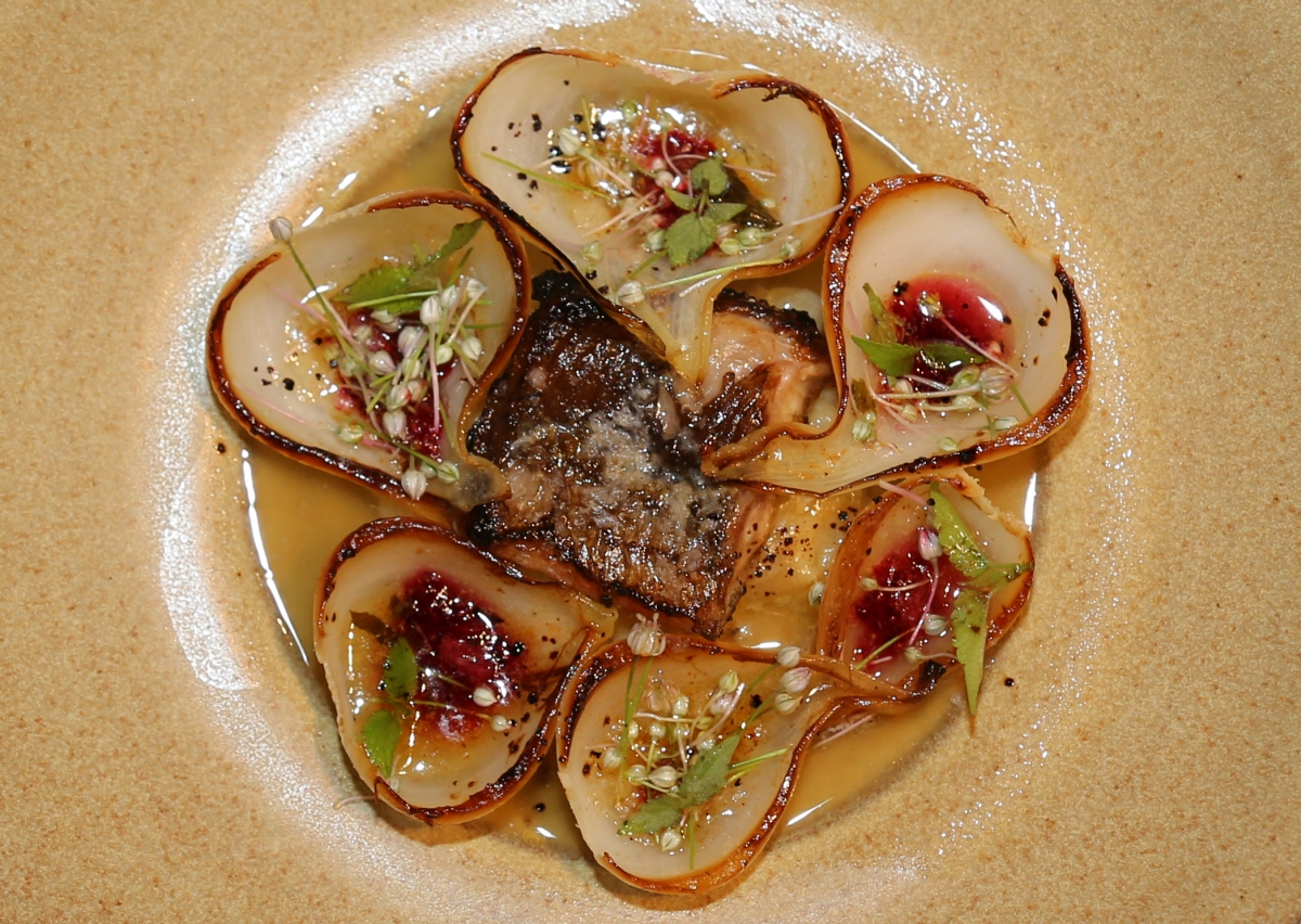 Gartenzwiebeln, über offenem Feuer gegrillter Aal, Porreeblpten und ein kräftiger Gemüsefond.