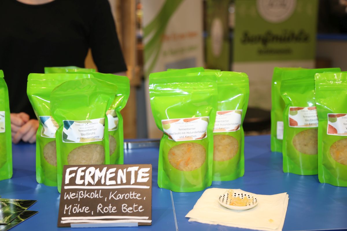 Die quietschgrünen Verpackungen – fermentiertes Grünzeug von Olaf Schnelle -, entdeckten wir schon auf der Grünen Woche an einem Stand des Landes Mecklenburg-Vorpommern. Sie fielen ins Auge, selbst unter den tausenden Lebensmittelofferten der internationalen Fressmesse. Und auch der Inhalt überzeugte die meisten Besucher, die eine Kostprobe wagten: Fermentierte Karotten mit Holunderblüten zum Beispiel, fermentierter Knollensellerie mit Quitte, fermentierte Purpur-Bete mit grünem Fenchelsaat und noch ein paar weitere Kreationen. In Supermärkten oder Feinkostgeschäften findet man diese Sauer-Spezialitäten jedoch nicht. Bisher gibt es sie ausschließlich im Onlineshop eines guten alten Bekannten – Olaf Schnelle.