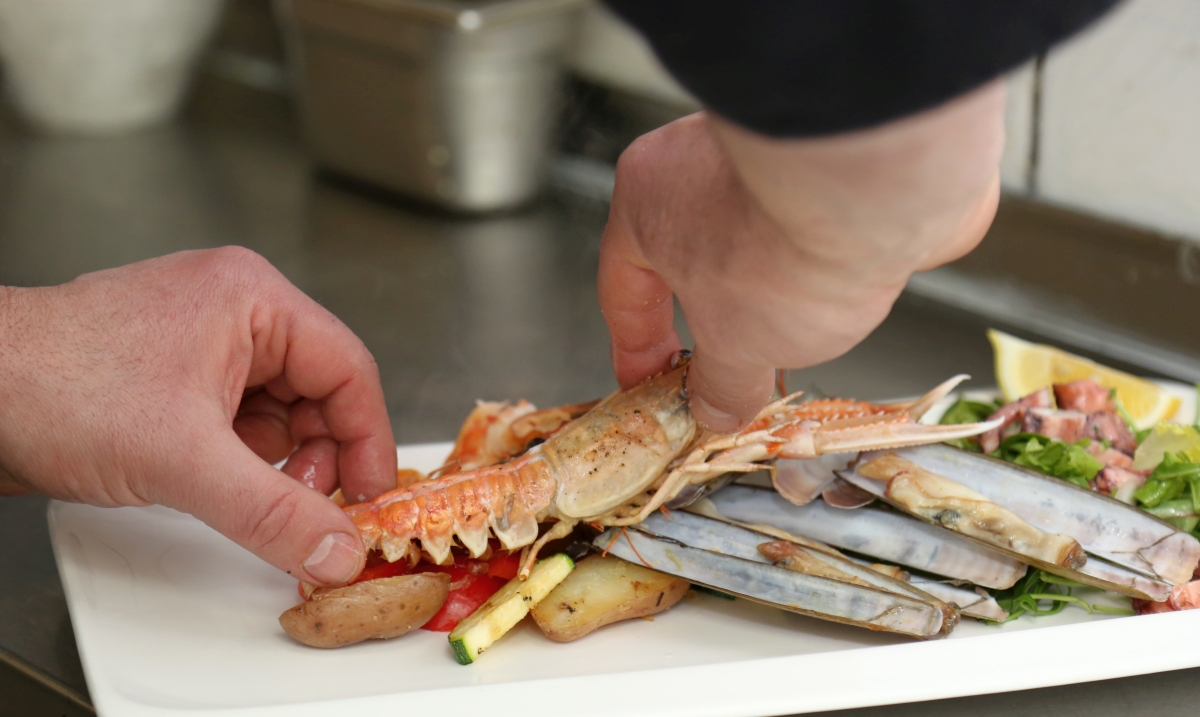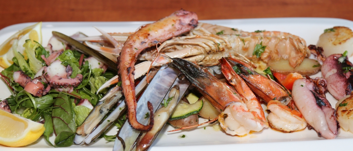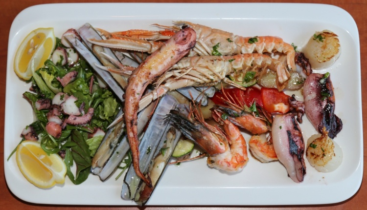 Ob der Grill die richtige Temperatur hat, erkennt der Küchenchef bereits am Klang: „noch nicht warm genug, das muss sich anders anhören“. Timing ist alles, denn nicht jede Fischsorte hat dieselbe Grilldauer. Nach einer Rekordzubereitungszeit von nicht einmal 10 Minuten dürfen wir kosten: das Auge isst mit, die Meeresfrüchteplatte sieht mindestens so gut aus wie sie schmeckt, die Fischauswahl ist knusprig und dennoch zart und besonders die gegrillten Calamari schmecken vorzüglich und endlich einmal nicht nach fadem Gummi.
