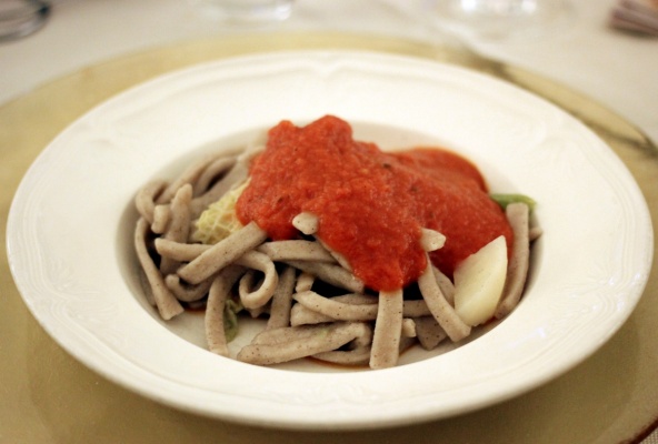 Zum Abendessen besuchten wir das Hotel Combolo, dass unsere Magenkapazitäten mit einem sechs-Gang-Menü an die Grenzen brachte. Als Veggi bekam ich ein anderes Menü, doch das Herzstück, die Pizzocheri della Valtellina, braune Bandnudeln aus Buchweizenmehl mit Kartoffeln und Wirsing, landete auch auf meinem Teller. Das Originalgericht beinhaltet auf 500 Gramm Nudeln, 200 Gramm Alpenbutter und sehr, sehr viel Käse. Da war ich ganz froh um die Veggi-Variante: Pizzoccheri mit Tomatensauce.
