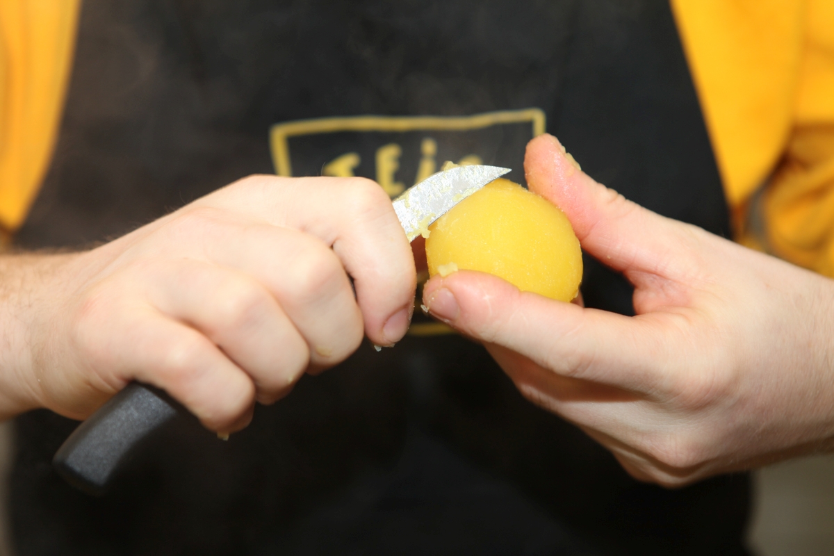 „Am Ende muss der Kartoffelsalat glänzen und schön schlonzig sein“, sagt Bruno Ebermann. Mit Letzterem meint er „gut feucht“. „Das ist deshalb wichtig, weil er nur dann zu allem passt, was nicht selber Sauce produziert, also Maultaschen oder Würstchen.“