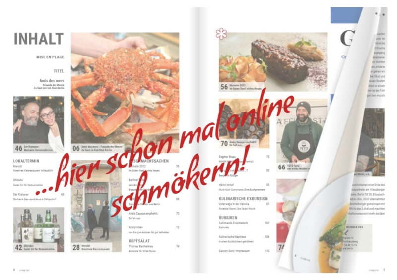 Gibt es Freunde der Meere – klar im Fish Klub Berlin! Zeugen dafür fanden wir im Restaurant Ora und einsunternull, waren in der Markthalle Neun und in der Wilma Shoppen Markthalle. Lesen Sie alles dazu im neuen GARCON Genuss Magazin! Neukölln und Kulinarik? Yes, vor allem mit Neuankömmling Merold. Wir kamen in den Nomunications-Modus im Shizuku, besuchten alte Bekannte im Kretaner und in der Brasserie am Gendarmenmarkt. Unseren Faible für Lebensmittelhandwerker kamen wir auch nach – Teto Tofu, schwarzer Knoblauch von Anais empfohlen und Wilde Wurst. Natürlich waren wir auch wieder in Italien unterwegs, diesmal in der Versilia bei den Vaiani´s. Markus Fuhrmann erzählt über die die Wunderknolle Kurkuma, die Mohr´s haben wieder ein schönes altes Kochbuch ausgegraben …