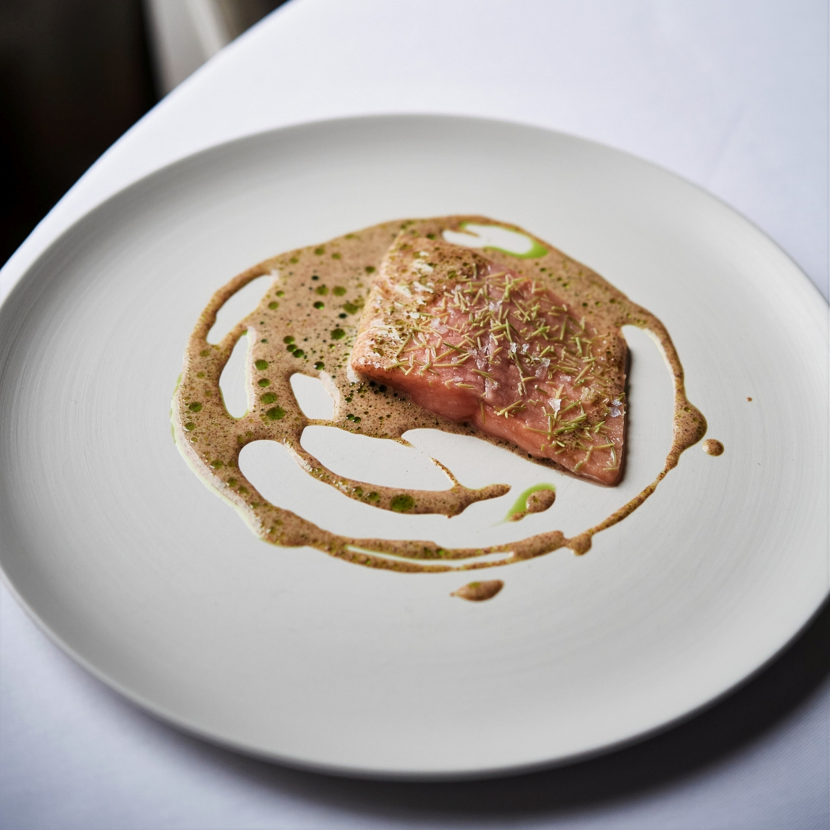 Wow. Und jetzt soll er auch noch nett sein? Das trifft es nicht ganz. Wenn man ihn durch die Reihen seines Teams in der offenen Küche schreiten sieht, liegt freudige, konzentrierte Beflissenheit in der Luft. Wie ein Schweizer Uhrwerk funktioniert er und sein Team, wie eine auf den Punkt eingespielte Choreografie. Zu der natürlich auch die Service-Brigade gehört. Selten hat uns ein Abend mit besterntem Menü soviel Freude bereitet. Fast tänzelnd, jedoch mit fachlicher Kompetenz werden die Gerichte beschrieben, mit ehrlichem Lächeln serviert und die Weinbegleitung trotz absurder Wünsche angepasst.