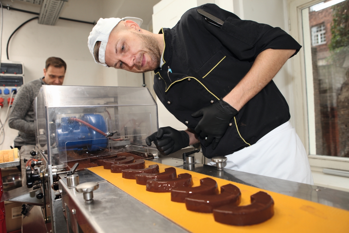 Spätestens wenn die anderthalb Meter lange Walze gewechselt werden muss, weiß man, weshalb zur Baumkuchenbäckerei immer zwei gehören. Lambecks zweiter Mann ist der Konditor Dennis Kirchmeier, 34, einst sein Lehrling und genauso baumkuchenverrückt wie Florian Lambeck. Wenn die Baumkuchen erkaltet sind, entfernt Kirchmeier die Stangen, schneidet das Backwerk in Scheiben und halbiert sie. Die halbmondförmigen Ringe werden nun, ebenfalls maschinell, mit einer Zartbitterkonfitüre – Kakaoanteil: solide 60 Prozent – überzogen, gekühlt und verpackt. Lediglich Sonderanfertigungen auf Kundenwunsch schokoliert Meister Lambeck noch in klassischer Handarbeit.