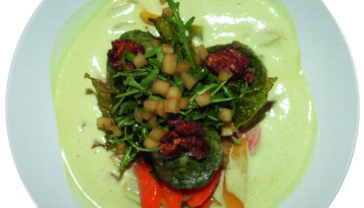 Auch Österreich ist nicht unbedingt ein Spinat-Land. Pro Kopf und Jahr kommen hier nur mickrige 1,4 Kilogramm zusammen, 300 Gramm weniger als in Deutschland. Dennoch gibt es zwischen Bregenz im Westen und Eisenstadt im Osten der Alpenrepublik einige spinatige Zubereitungen von erster Güte: in Vorarlberg sind es die Spinatspätzle, in der Steiermark die Spinatsemmeln und in Oberösterreich und Tirol die Spinatknödel. Eine durch und durch runde Sache ist dieser regionale Austro-Klassiker auch im Berliner Restaurant SodaZitron in Prenzlauer Berg nahe des Kollwitzplatzes – außen prall, innen flaumig, mit einem Hauch Knoblauch und leicht muskatig. Unser Berliner Teller!