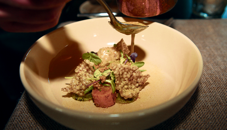 Das besonders fettreich marmorierte und mit seiner schmelzenden Textur geschmacklich einzigartige Fleisch des neuseeländischen Ora King, des Rolls-Royce unter den Lachsen, wird – leicht gesalzen und geflämmt – mit in Salicornia-Öl marinierten Kiwis, einem würzigen Kiwi-Gel, Tapioka-Chips und einer mit Yuzu-Pate und frischen Yuzu-Saft aromatisierten Beurre blanc kombiniert. Das alles klingt zwar ein bisschen abgehoben, ist aber letzten Endes extrem nahbar und zugleich mutig modern.