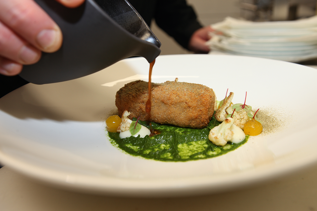 Kalbskopf – Petersilie / Blumenkohl / Kapern / Sauce Robert: ein Gericht, bei dem sich offenbar die Geister scheiden. „Zwanzig Prozent unserer Gäste lehnen es kategorisch ab, der Rest kommt aus dem Jubeln nicht mehr raus“, so Küchenchef Marco Wahl. Das Thema – den Kalbskopf – behandelt Wahl in klassisch-französischer Manier: Kochen im Essigsud, abpuhlen, die Hälfte wolfen, die andere Hälfte hacken, portionieren, panieren, ausbacken. Eskortiert wird das saftige Stück von einigen in Nussbutter angebratenen Blumenkohlröschen, Blumenkohl- und Petersilienpüree, Kapernstaub, Zitronengel, einer auf Kalbsjus-Basis gekochten Sauce Robert und – für die Optik – einigen Blättchen Blutampfer. Wir sagen „Chapeau“ und bedanken uns für diesen Klassiker.