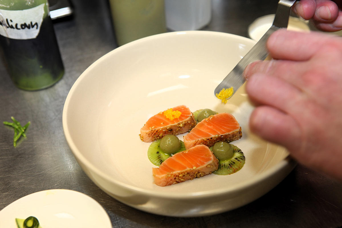 Dass das kulinarische Interesse des Küchenchefs Marco Wahl und der Männern seiner Brigade nicht nur der Umgebung, sondern auch anderen Regionen der Welt gilt, beweist schon die Vorspeise des fünfgängigen Sawito-Menüs: Ora King Lachs – Gurke / Yuzu / Kiwi / Salicornia / Beurre blanc.