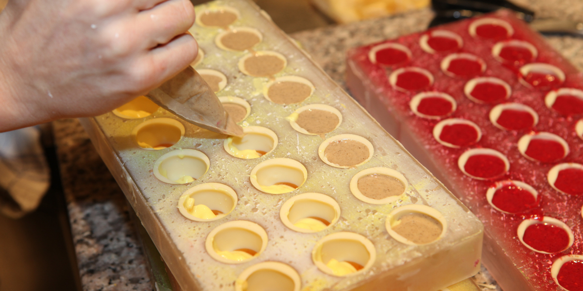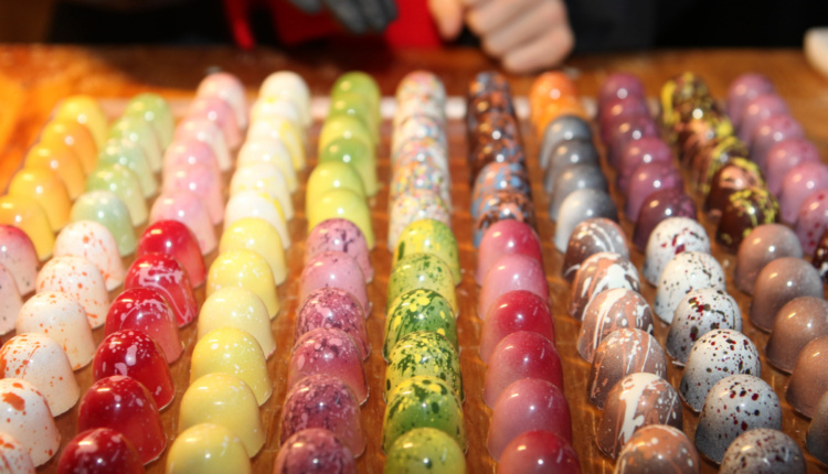 Seit einiger Zeit hat hier auch Marie-Theres Mang einen Stand, an dem man die Pralinenmacherin zumeist live erleben kann – beispielsweise beim Fachsimpel mit Kollegen über die Besonderheiten, der von ihr bevorzugten Schweizer Felchlin-Schokolade aus Ibach im Kanton Schwyz oder im Gespräch mit Kunden über deren koloristisches Empfinden angesichts der Muya-Kreationen.