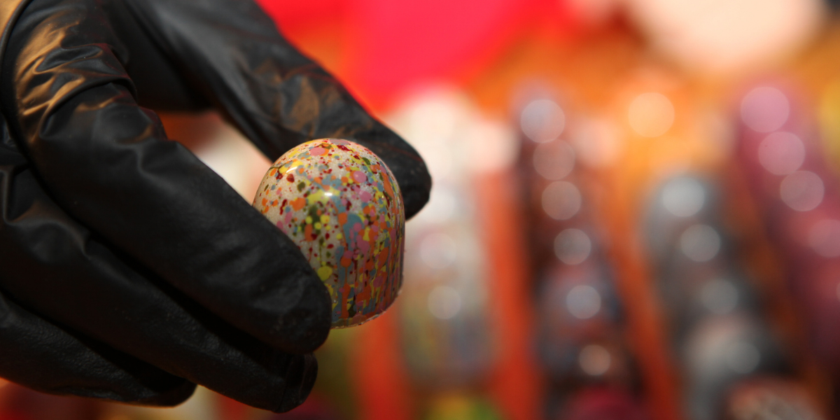 „Farben spielen eine wichtige Rolle als Wohlfühlfaktor im Leben, auch in der Kulinarik“, so Marie-Theres Mang. Wir beobachten einen Mann, der zehn Pralinen ordert und eine davon sofort probiert. „Wow“, sagt er, „da macht es richtig Peng im Mund!“