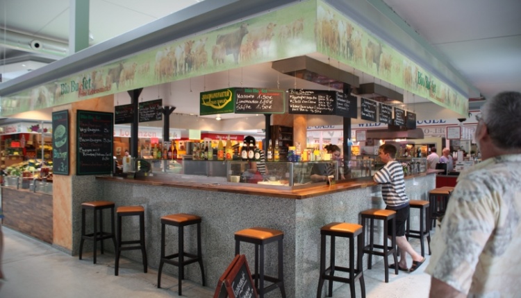 Sitzen und quatschen wie Gott in Frankreich, und plötzlich diese Stimme: Guten Morgen, ich bin Horst Köhler. Horst Köhler? Hockerwende. Da steht der Mann, graue, wache Augen, graues, kurzes Haar, grauer Drei-Tage-Bart, dunkler Anzug, weißes Hemd, Gott sei Dank krawattenlos. Köhler ist der, „blödes Wort“, sagt er, „Centermanager“. Zuständig für die Vermietung und Vermarktung. Er plant kulinarische Veranstaltungen, will eine Bierbar und eine Kochschule einrichten, spricht von Erlebniskauf und davon, dass der Eventcharakter der Markthalle deutlicher, die Ausstrahlung über den Kiez hinaus stärker werden müssen. Zum Glück  ist der Mann Thüringer, da klingen die Forderungen nicht wie Befehle. Au revoir, Charles.