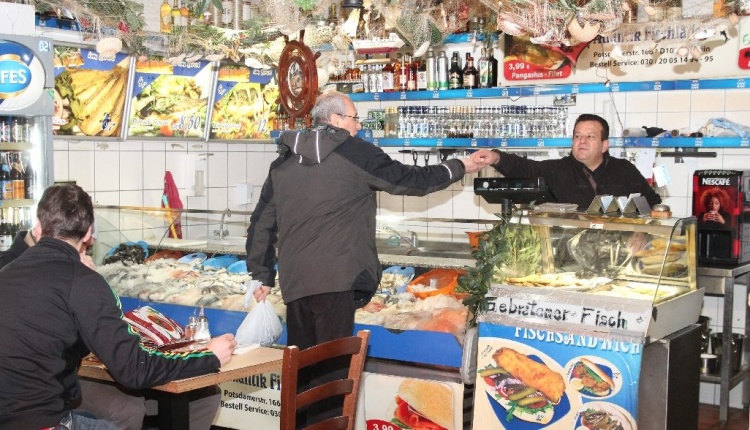 „Frischer geht’s nicht“, sagt einer der Mittagsgäste. Ein zweiter fügt hinzu: „Wie im KaDeWe, nur weit preiswerter.“ Ein dritter schließlich hat offenbar seine Lieblingsfische entdeckt und bittet, sie ihm in der Pfanne zu braten. „Mit gehackter Petersilie, bitte.“ „Kein Problem.“ Es sind Stinte, in Berlin sonst kaum zu haben.