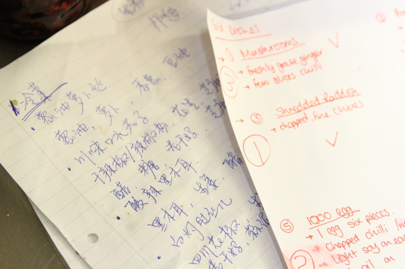 Sie ist die Köchin des heutigen Abends, 30, Chinesin aus Shanghai, seit vier Jahren in Berlin. Kochen hat sie von ihrer Großmutter gelernt und das offensichtlich ziemlich gut. Küchenchaos, meist Hobbyköchen eigen, gibt es nicht. Lee arbeitet blitzsauber und blitzschnell. Lediglich als es an die Schweinsfüße geht, flucht sie leise. Der Metzger hat vergessen Portionsstücke zu sägen und sein türkischer Kollege um die Ecke lehnt es ab, zu helfen. Schweinefleisch, nein danke. Einem zufällig vorbeischauendem Freund gelingt es schließlich, mit Hilfe einer Axt und einer Metallsäge, die Knochen zu teilen. Ansonsten läuft die Vorbereitung des Neun-Gänge-Menüs ohne Hektik, Lee hat dafür eine Art Drehbuch, allerdings auf chinesisch.