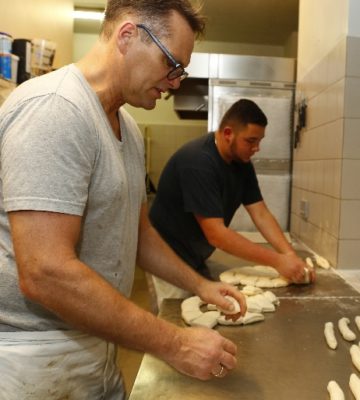 Und nochmal Lorenze: „Wir machen hier nichts ruck-zuck, wir setzen auf Zeit, das ist das sicherste Mittel für Qualität.“ Das Ergebnis dieser langen Teigführung, wie es im Bäckerdeutsch heißt, sind Brote und Brötchen, die diese Benennungen verdienen – im Gegensatz etwa zu den Teigrohlingen, die mit Hilfe chemischer Triebmittel und ohne jegliche Garzeit hergestellt, tiefgefroren und dann im Automaten des Discounters aufgebacken werden. „Wir machen ehrliches Brot, Ende“, so Lorenze.