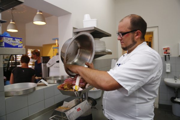 „Das wird das Brät für unseren Fleischkäse“, so der 31-jährige, grüner Speck und Gewürze kommen noch dazu, Salz, Pfeffer, Kümmel, Muskat, Piment, Zitronenzesten. „Ralf Hahn arbeitet drei Tage die Woche in der Manufakturküche, die restliche Zeit braucht er für seine Ausbildung zum Küchenmeister. „Um danach wieder in ein richtiges Restaurant zurückzukehren?“ Er bemerkt den Unterton in der Frage. „ich sehe mich hier nicht als Koch zweiter Klasse, sondern als Lebensmittelproduzent, der versucht, aus einfachen Zutaten etwas Besonderes zu machen.