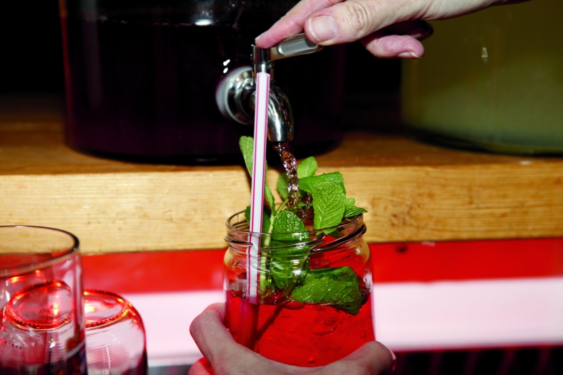 Samstagabend am Pignut-BBQ-Stand. Do you have any soft drinks? You can have a lemonade or mineral water. O.K., I´ll take a glass of cider then. A small light ale for me. And for me a glass of claret, please.