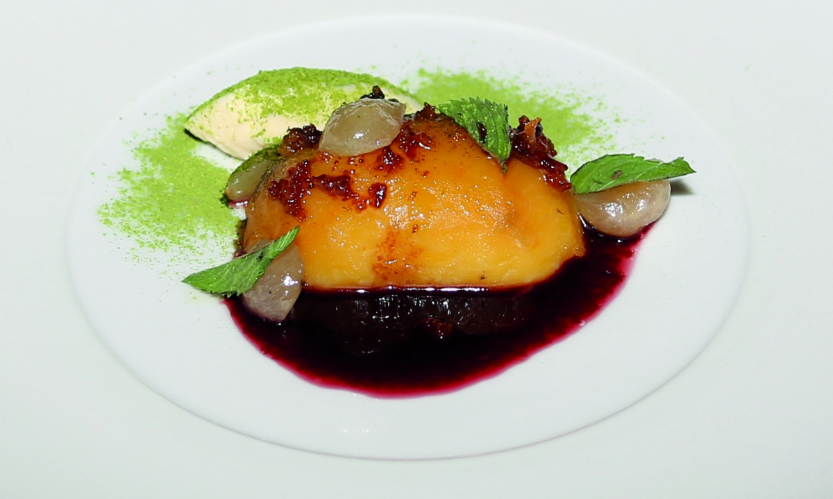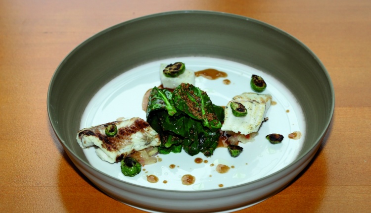 Gelernt hat er das bei seinem Landsmann Jörg Wörther, einst ein in Promi- und Gourmet-Presse omnipräsenter Küchenkünstler aus Salzburg, um den es allerdings heuer still geworden ist. Die portionierten und übrigens auch hautfreien Hechtfilets (tatsächlich haben wir in zwei Portionen nicht mal den Hauch einer Gräte gefunden) röstet Daniel Schmidthaler kurz auf der Grillplatte an, um geschmacksstärkende Röstaromen zu erzeugen und serviert sie mit leicht gedünsteten Rosenkohlblättern („dem so genannten Auswuchs, der Spitze des abgeernteten Strunkes“), halbierten und ebenfalls gegrillten Rosenkohlköpfen und einem säuerlichen Gemüse von der Zierquitte.