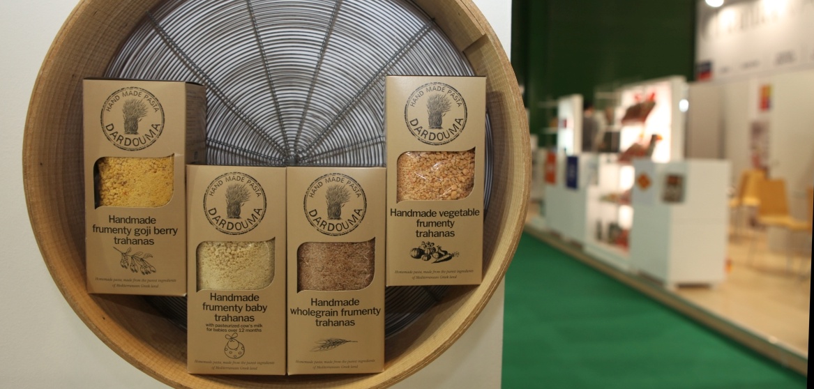 Angesichts der jungen Aussteller am Dardouma-Stand könnte man meinen, dass hier ein Start-up Messepremiere hat, aber der Eindruck täuschte. Der 31-jährige Maschinenbau-Ingenieur Evangelos Mallios und sein Bruder John, 39, Diplom-Landwirt, setzen eine über einhundertjährige Familientradition fort, die einst ihre Urgroßmutter begründete. Es geht um die Herstellung der traditionellen griechischen Pasta Trahanas und natürlich um die Vermarktung der stecknadelgroßen Nudeln – dafür ist Sofia Spanou zusrändig. „Pasta-Laboratorium“ nennen die drei ihre Manufaktur im Dörfchen Velos, das inmitten eines Naturschutzgebietes auf der Insel Evia liegt.