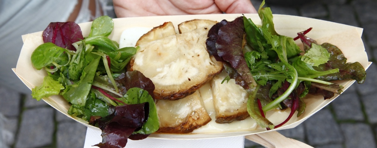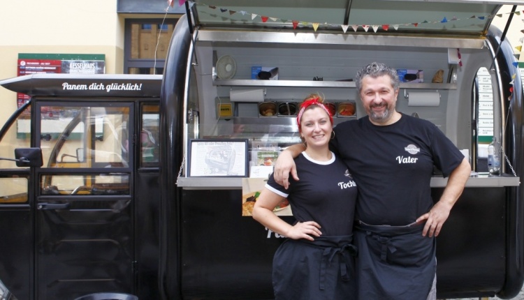 Eine chinesische Dreirad-Konstruktion mit Elektroantrieb (15 km/h) und küchentechnischer Ausstattung (Elektrogrill, Kühlschrank, Waschbecken). Gemeinsam mit seiner Tochter Marla, 25, die an der Slow-Food-Universität im italienischen Pollenzo Gastronomische Wissenschaften studiert hat, bietet Kayacik Brote mit Füllungen an. Panem et explementa: frisch zubereitet, geschmackvoll angerichtet und superlecker.