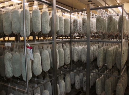 Nur fast ansteckend, denn der nächste Stopp, ein Bresaolo-Hersteller, führte mich an meine Grenzen. Bresaolo wird aus der Keule des Rindes hergestellt und ist ein Produkt mit geschützer geografischer Angabe (g.g.A.), also ein Produkt dessen Qualität und Ansehen eng mit einer Region verbunden ist. Die europäische Union fördert Produkte mit g.g.A. sowie g.U. (geschützte Ursprungsbezeichnung) Kennzeichnungen und erhält somit Erzeugnisse, die in Europa hergestellt und deren Ressourcen aus europäischen Regionen kommen. Wir besuchten den Hersteller Del Zoppo und seine Produktionsstätte mit riesigen Kühlhäusern, voll gepackt mit unterschiedlich ausgereiften Rinderkeulen.