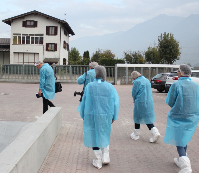 Produktionsleiterin Marta Donadoni führte uns durch die Molkerei Latteria di Delebio. Die Produktionsstätte ist Teil eines Konsortiums für den Schutz der Käsesorten Valtellina Casera und Bitto und umfasst 68 Hersteller aus der Region. Deren Ziel ist es, die traditionelle Produktionsweise ihrer Lebensmittel zu erhalten und so verwenden sie für ihren Käse ausschließlich Milch aus der Region. Letztes Jahr sammelte das Konsortium auf diese Weise 34 Millionen Liter Milch von im Tal ansässigen kleinen Erzeugern, die nur wenige Milchkühe besitzen, bis hin zu Großerzeugern mit 200 Tieren.