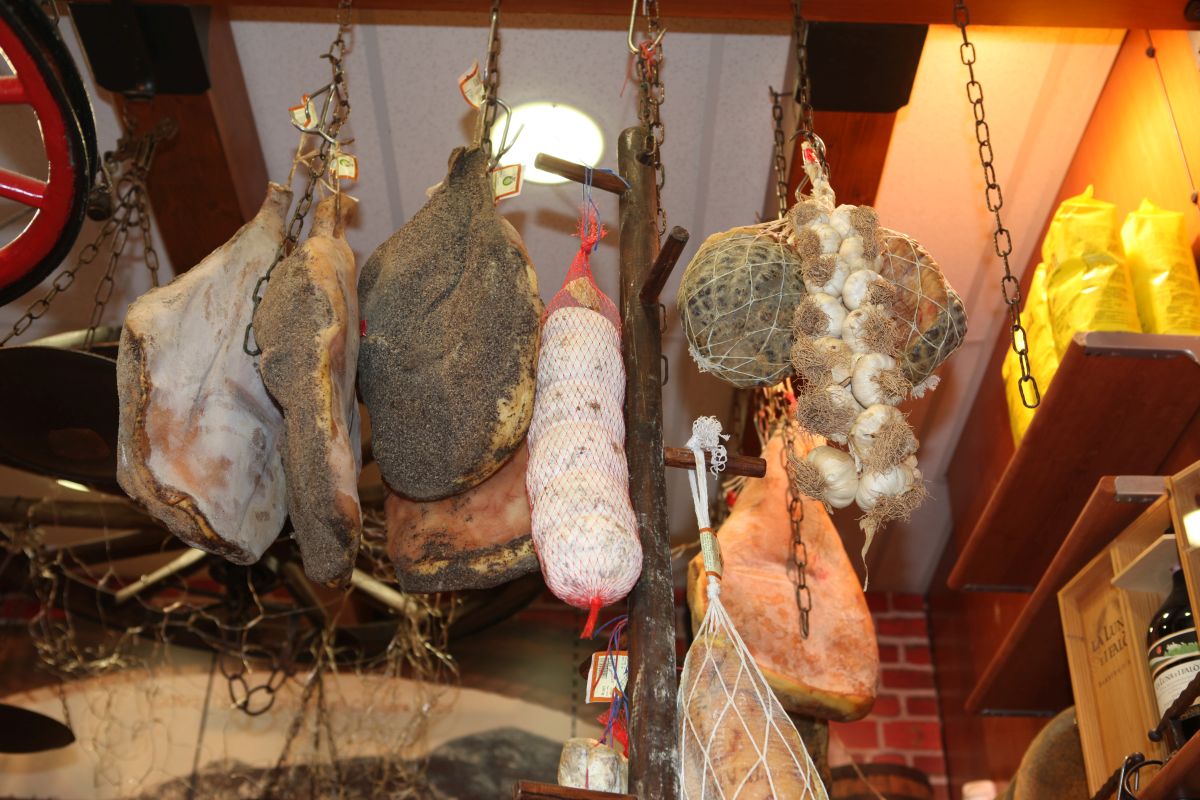 Da sind stolze 16 verschiedene Salami- und fünf Specksorten; es gibt die Biroldo, eine würzige Rotwurst, in der viele Innereien verarbeitet werden; die Sopressata, eine kräftige Sülzwurst vor allem aus Kopffleisch und Schweineschwarten; die unvermeindlichen Salsicce und natürlich jenen sagenhaften Schinken, dessen Name uns einiges Kopfzerbrechen bereitet.