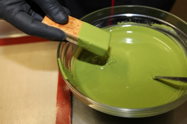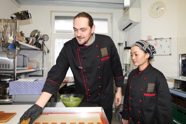 „Matcha ist ein Sensibelchen“, erläutert Sven Schumacher, „äußerst licht- und luftempfindlich. Man darf sich also bei der Verarbeitung keine Fehler erlauben, sonst sind die jadegrüne Farbe und der feine, süßlich-herbe Geschmack futsch.“ „Bei einem Einkaufspreis von 140 Euro pro Kilo wäre das ein Desaster“, fügt er dann noch hinzu.