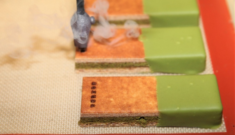 Die Nazuna-Variante ist nicht rund, wie die meisten Baumkuchen, sondern rechteckig. „Unsere Version besteht aus zwölf Schichten“, erläutert Sven Schumacher, „die einzeln von Hand aufgetragen und im Salamander gebacken werden.“ Zum Schluss bekommen die akkurat geschnittenen Stücke einen Überzug aus Matcha-Kuvertüre und ein Branding: Nazuna. Das steht für edel, geschmackvoll, gut.