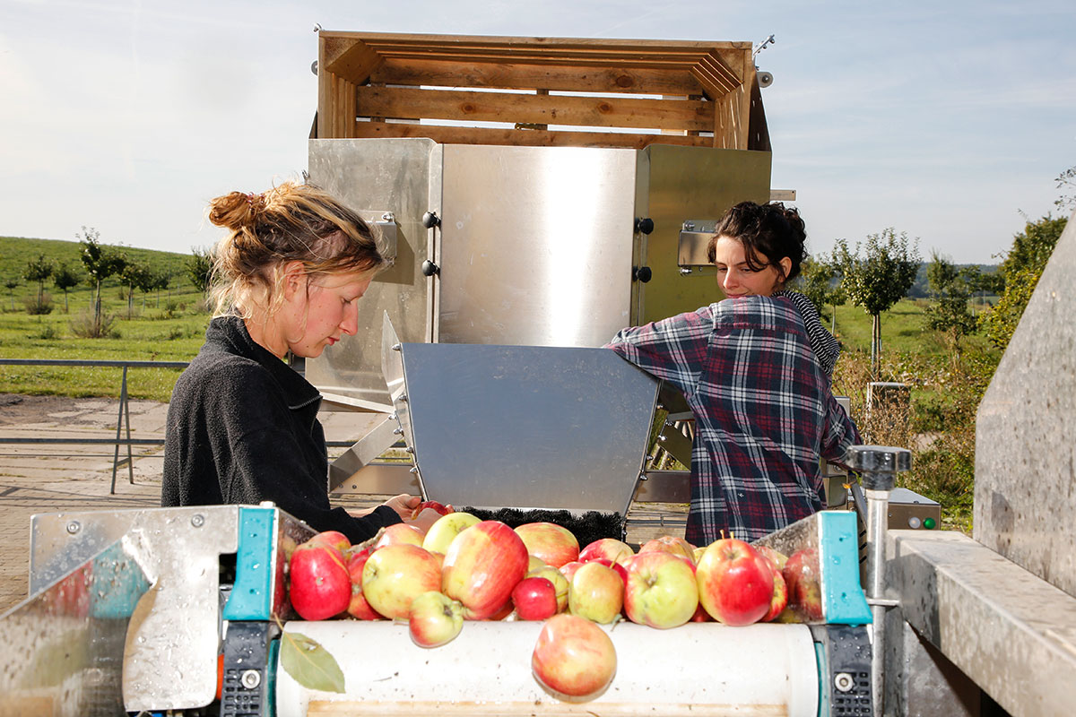 Chef der Bio-Mosterei ist der 33-jährige Uckermärker Nikolas Bohrisch, zupackend und wortkarg. Seine Mitarbeiter sind Studenten. „Ökolandbau Eberswalde, die wissen, wie’s läuft”, Bohrischs höchste Form der Anerkennung. Außerdem erfahren wir, dass ihr Streuobst aus dem Uckermärker Land mit einer traditionellen Packpresse gepresst wird. Es handelt sich nicht um die modernste Technik, aber um eine, die beste Saftqualität liefert.