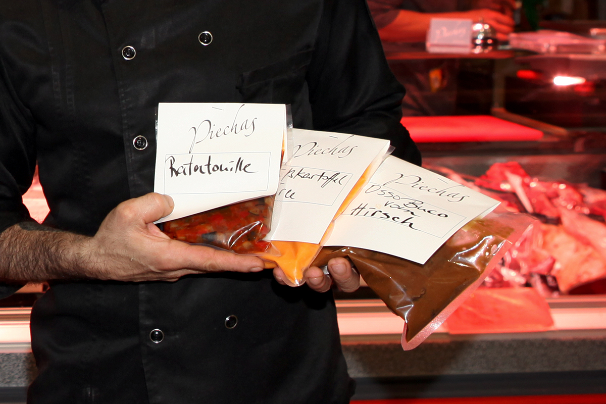 Immer mittwochs kocht Ulrike Pech gemeinsam mit ihrem Team und vakuumiert portionsweise. Das Ergebnis ist Convenience vom Allerfeinsten. Es gibt Kartoffel- und Süßkartoffelpüree, Sellerie-Apfel-Creme, Rotkohl, Sauerkohl und Ratatouille. Auch Rinderroulade, Schweinebraten, Tafelspitz, Ossobuco vom Hirsch und Risotto mit Portobello sind zu haben. „Unsere Kunden können unter diesen und etlichen anderen Komponenten wählen und sich ein Gericht selbst zusammenstellen”, erklärt sie den Vorteil ihrer To-go-Offerte. „Dazu kommen weitere”, ergänzt Piecha, „etwa, dass man die Vakuumbeutel gut und gerne ein paar Tage im Kühlschrank aufbewahren oder auch einfrieren kann, ohne dass der Inhalt Schaden nimmt.”
