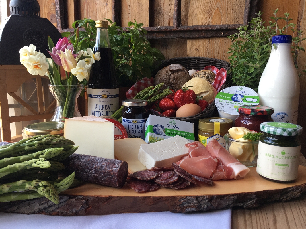 Dazu empfehlen wir euch legefrische (Oster) Eier vom Schwantener Wiesenhuhn, Milch, Butter, Käse und Wurstspezialitäten (z.T. in Bio-Qualität) aus unserer Region, aromatisch-frischen Erdbeeren, frisch gemostete Direktsäfte, spritzige Seccos und auch das Osterwasser darf natürlich nicht fehlen: Probiert doch mal unsere hochprozentigen Spezialitäten, wie den Heidelbeerbrand, der ausschließlich aus den überreifen Heidelbeeren des vergangenen Sommers ohne Zugabe von Zucker destilliert wird.