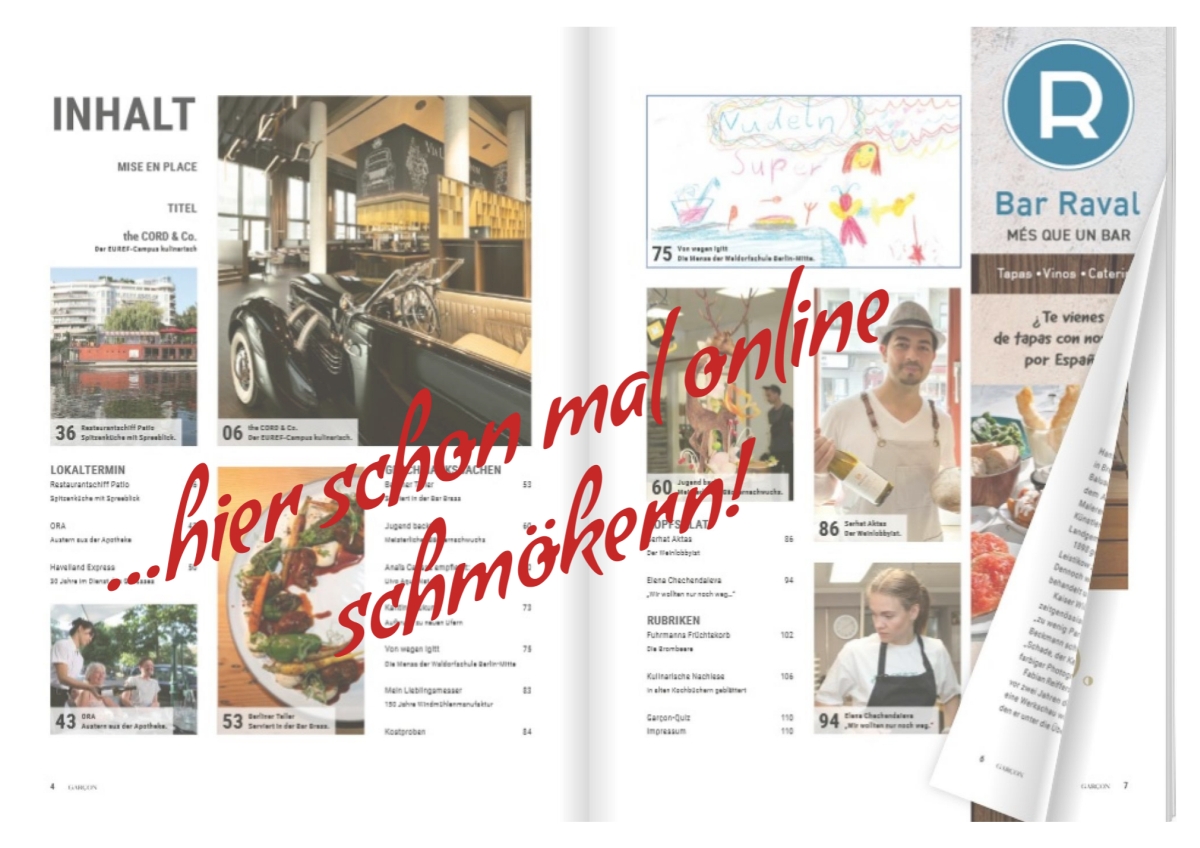 Nachhaltigkeit ist in den vergangenen Jahren großes Thema geworden, dies sieht auch das Team von Kantine Zukunft so, welche das in der Gemeinschaftsgastronomie einführen möchten. Ein Vorbild dafür könnte die Mensa der Waldorfschule Berlin-Mitte sein, bei der schon längst auf Fleisch verzichtet wird. Wir lernten eine entzückende Frau namens Elena Chechendaieva kennen, alles über sie findest du im neuen GARCON Genuss Magazin. Markus Fuhrmann erzählt über die Brombeere und die Mohr´s haben wieder ein tolles altes Kochbuch ausgekramt …