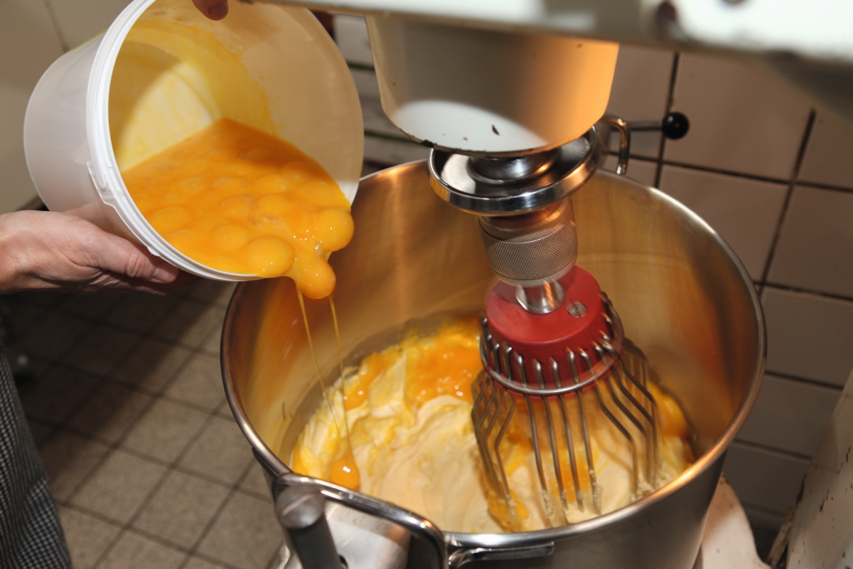 Bevor wir der heiligen Handlung der Baumkuchenherstellung beiwohnen dürfen, gibt Meister Lambeck noch den wahrscheinlich wichtigsten Hinweis: „Entscheidend für die Qualität eines Baumkuchens ist die Masse.“ Damit meint er das, was wir Laien normalerweise Teig nennen. Lambeck folgt, was die Zutaten seiner Masse betrifft, einem zwar ungeschriebenen, aber von den meisten Profis anerkannten Baumkuchenreinheitsgebot: Butter, Zucker, Eier („ausschließlich Bio-Eier und frisch aufgeschlagen“), Mehl („wir setzen auf Dinkelmehl“), Vanille und Zitronenabrieb („fürs Aroma“) und ein bisschen Marzipan („für die Frische“) – mehr nicht. Kein Rum, keine Tonkabohnen, keine Trockenfrüchte und schon gar nichts aus dem Chemiebaukasten. Immer prüft Florian Lambeck die Konsistenz der Masse. Cremig muss sie sein, und fließen muss sie. Dann füllt er sie in die Wanne der Baumkuchenmaschine und taucht die drehende Walze in die Masse. Anschließend wird gebacken, Schicht für Schicht, pro Schicht eine Minute, sechzehnmal.