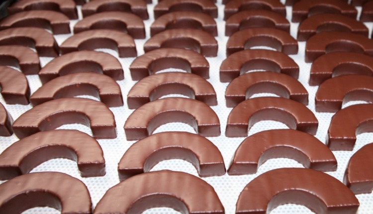 Spätestens wenn die anderthalb Meter lange Walze gewechselt werden muss, weiß man, weshalb zur Baumkuchenbäckerei immer zwei gehören. Lambecks zweiter Mann ist der Konditor Dennis Kirchmeier, 34, einst sein Lehrling und genauso baumkuchenverrückt wie Florian Lambeck. Wenn die Baumkuchen erkaltet sind, entfernt Kirchmeier die Stangen, schneidet das Backwerk in Scheiben und halbiert sie. Die halbmondförmigen Ringe werden nun, ebenfalls maschinell, mit einer Zartbitterkonfitüre – Kakaoanteil: solide 60 Prozent – überzogen, gekühlt und verpackt. Lediglich Sonderanfertigungen auf Kundenwunsch schokoliert Meister Lambeck noch in klassischer Handarbeit.
