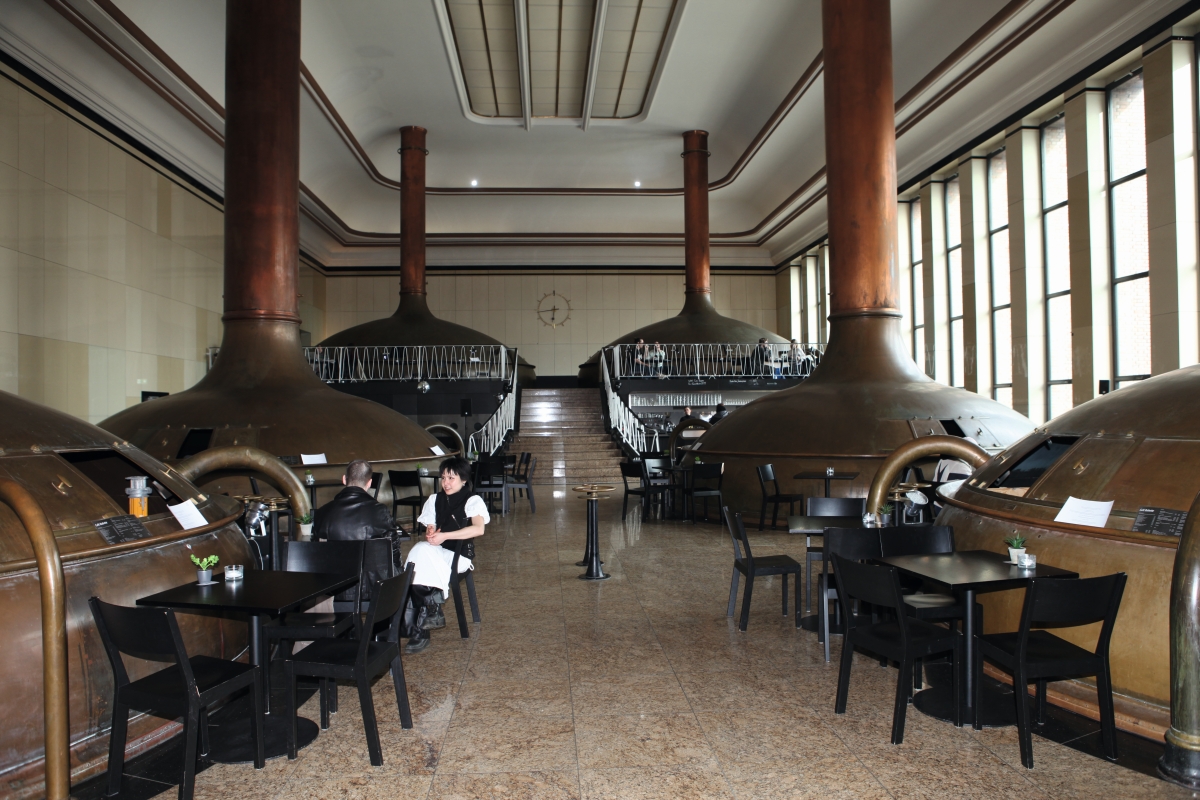 Bleibt noch die Frage, wie es der Brauerei in der Nach-Wilko-Bereit-Ära bisher ergangen ist – also, auf zum Rollberg! Wer lange nicht in diesem Neuköllner Kiez zwischen Hermann- und Karl-Marx-Straße war, bekommt schon auf dem Weg das große Staunen. Ein gutes Dutzend schicker Neubauten, wo sich früher Tristesse breit machte. Und dann der Clou: Das denkmalgeschützte Gebäude der Kindl Brauerei AG, in dem einst das Berliner Kindl erfunden und von 1890 bis 2005 in Pilsener Brauart auch hergestellt wurde, beherbergt jetzt ein Zentrum für zeitgenössische Kunst – das KINDL. Wow! Auch die Rollberg-Brauerei hat hier noch ihren Sitz, doch die muss jetzt warten. Manchmal kommt eben die Kunst vor dem Suff. Im ehemaligen Kesselhaus gibt es eine raumgreifende Installation von Mona Hatoum, im früheren Maschinenhaus M2 werden Werke von Friedrich Kunath – Malerei, Skulptur, Installation und Video – präsentiert und im einstigen Maschinenhaus M1 eine Installation der Israelin Larissa Sansour und des Dänen Søren Lind, in deren Zentrum eine dreikanalige Videoarbeit steht – As If No Misfortune Had Occurred in the Night. Im Sudhaus (s. Bild unten) schließlich lädt das Café Babette zu kleinen veganen Köstlichkeiten, Limonaden oder einem Rollberg rot.