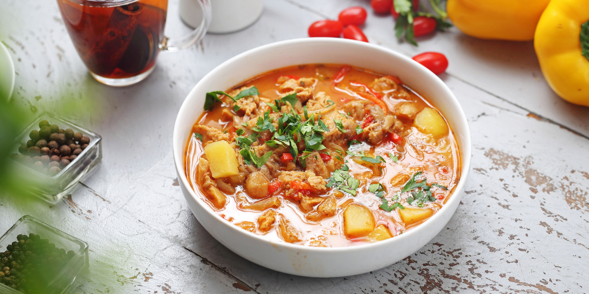 • Zutaten: Fleisch oder Linsen, Zwiebeln, Knoblauch, Paprika, Tomatenmark, Brühe, Gewürze wie Paprika, Kümmel, Majoran, optional Rotwein, Sauerrahm