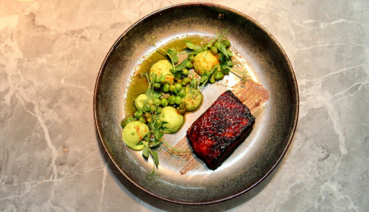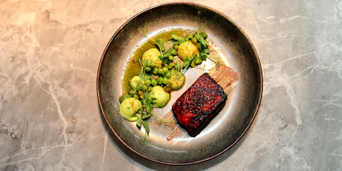 Das Titelbild und damit unser Berliner Teller im QIU: Besonders gefiel uns ein Gericht, das sich durch perfekte Harmonie und punktuell gesetzte Geschmacksakzente auszeichnete. Lackierte Rippchen vom Fläminger Duroc-Schwein, Erbsencreme mit einem Hauch Piment d’Espelette und glasierte Erbsen, die mit Minzöl interessant aromatisiert wurden.