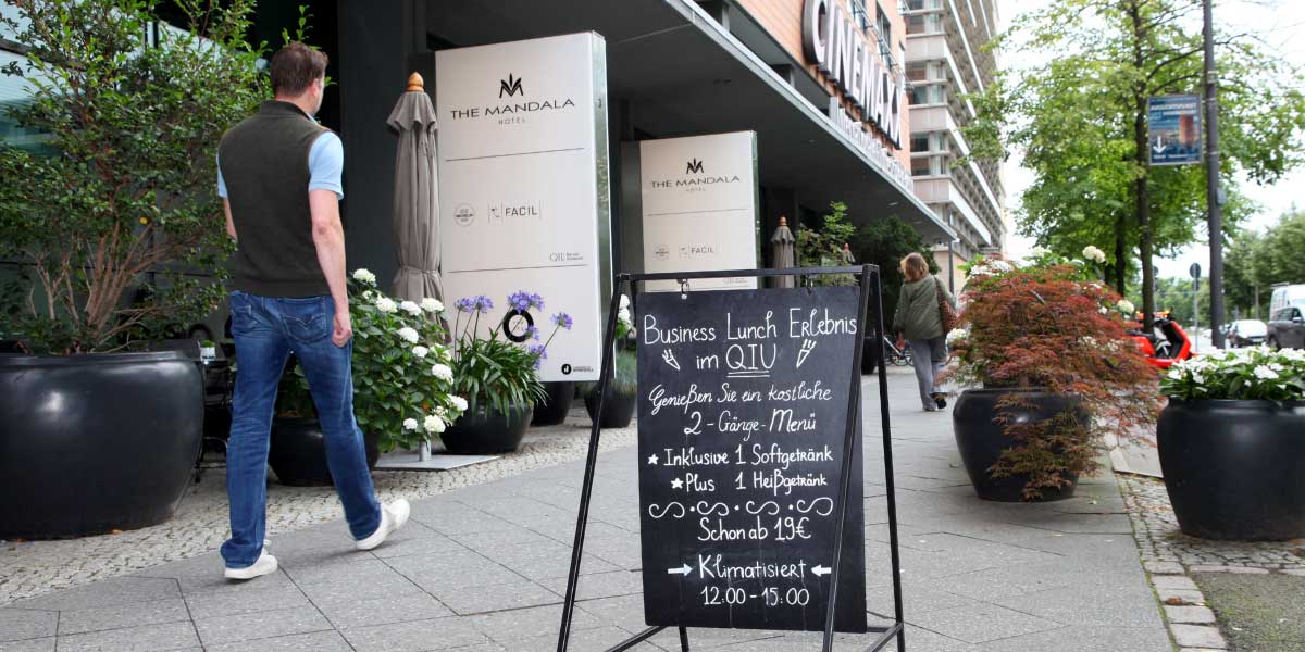 Der Aufsteller auf dem Bürgersteig der Potsdamer Straße passt zwar nur bedingt zum Designhotel The Mandala mit dem famosen Zwei-Sterne-Restaurant Facil on top, aber sei’s drum – auf jeden Fall hilft er Menschen, die nicht regelmäßig in Nobelherbergen und Sternerestaurants verkehren, mögliche Schwellenängste zu überwinden. Die Tafel wirbt für die Lunchofferten im QIU, der früheren Hotelbar, die vor einiger Zeit den Zusatz „Restaurant“ erhielt und damit nicht mehr bar jeder nennenswerten Verköstigung ist. Ganz im Gegenteil. The Mandala-Küchendirektor Michael Kempf hat für das QIU ein kulinarisches Konzept maßgeschneidert und nennt es sogar den „kleinen Bruder des Facil“.