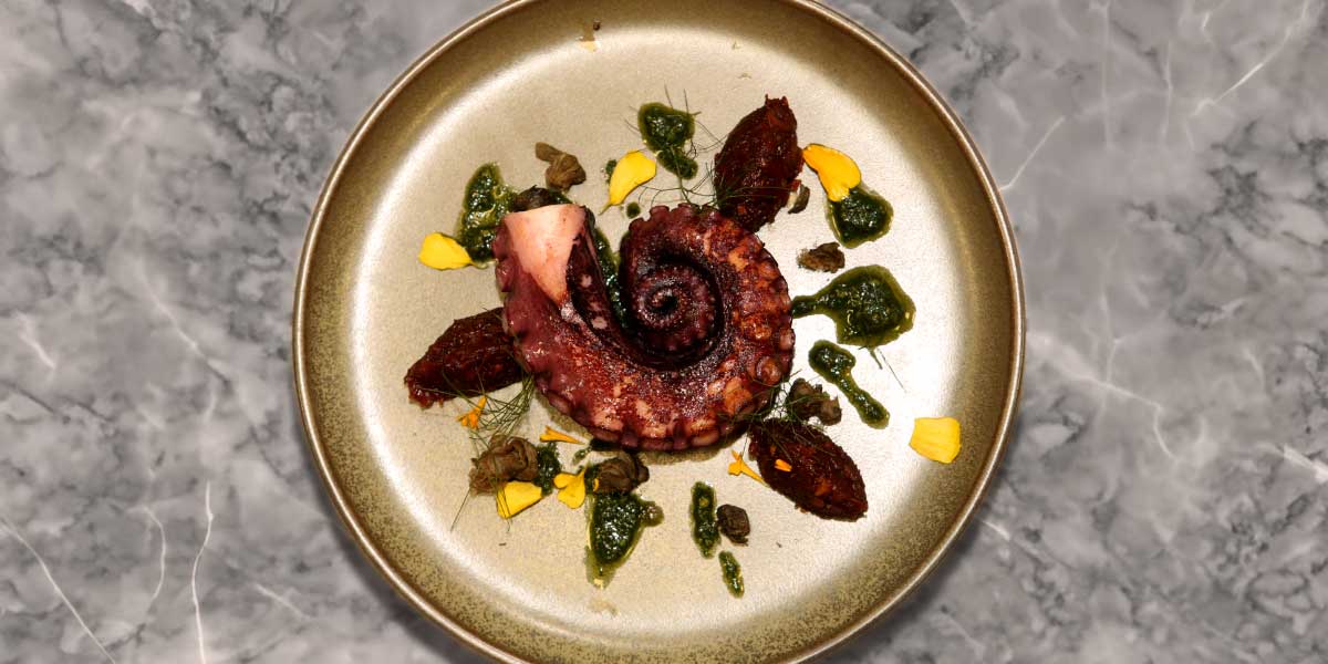 Die Karte gilt sowohl für die Lunch- als auch die Dinnertime und Michael Kempf legt Wert darauf, dass die QIU-Gerichte nah bei den Offerten seines Zwei-Sterne- Restaurants Facil liegen. „Was wir im QIU servieren, ist von den gleichen Ideen inspiriert wie das, was im Facil auf die Teller kommt“, erklärt er, „die Portionen sind lediglich kleiner, und wir müssen natürlich auf preistreibende Luxusprodukte wie Kaviar, Trüffel oder Steinbutt verzichten.“ „Außerdem“, fügt der Küchendirektor hinzu, „gibt es auch eine direkte Kooperation, indem Grundprodukte – etwa der Oktopus – im Facil vorbereitet und im QIU weiterverarbeitet werden.